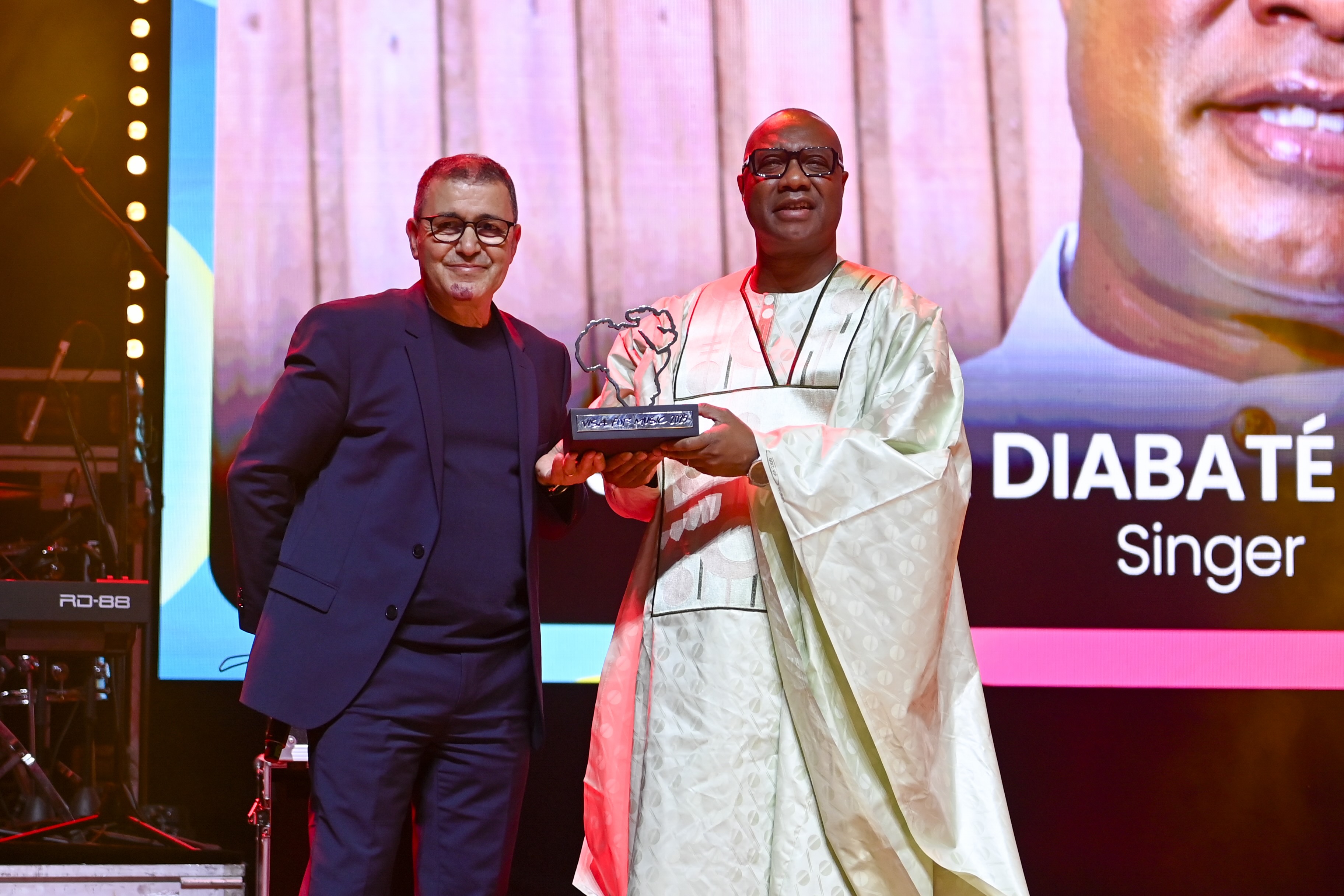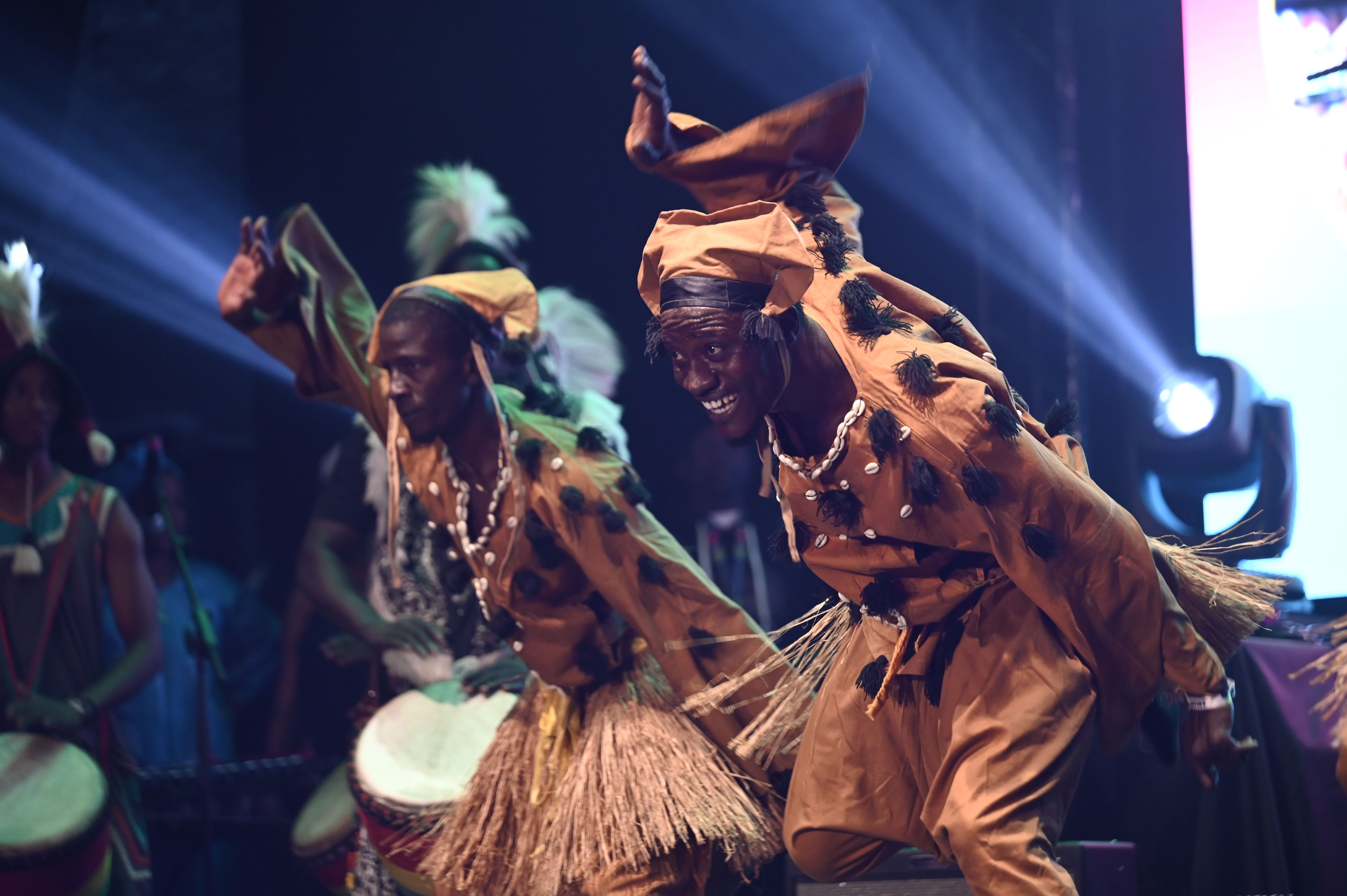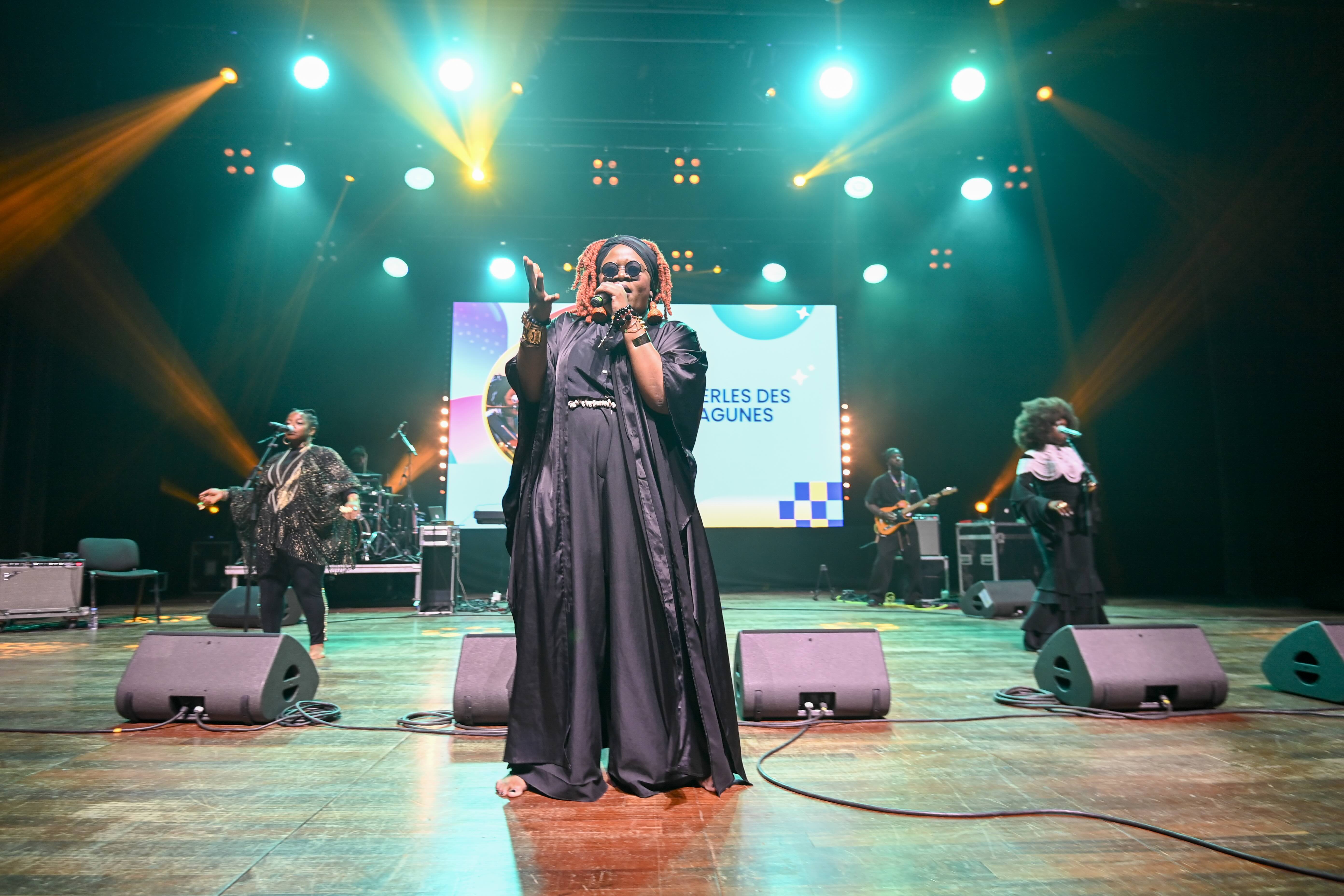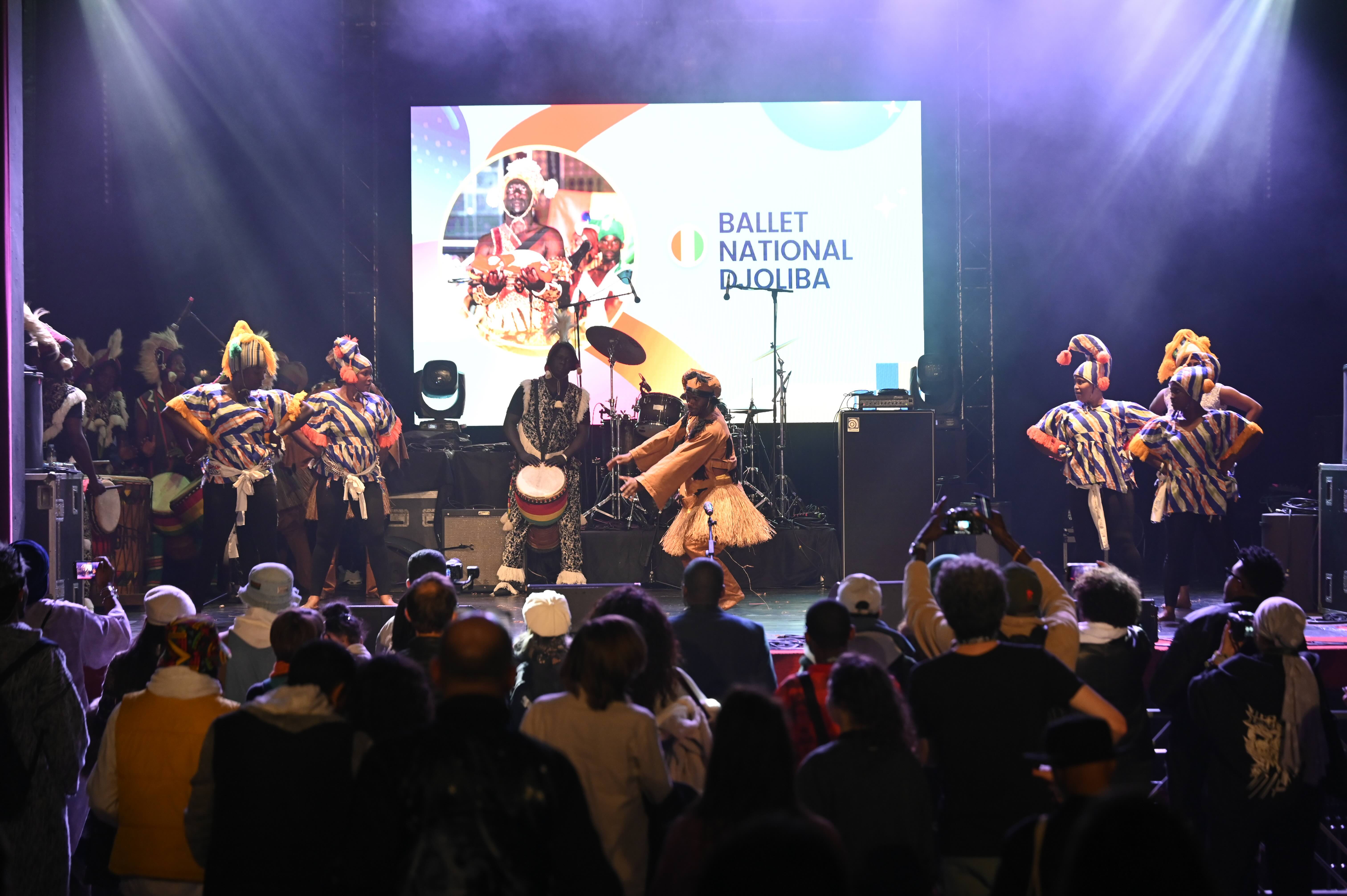 verdiepingen is verspreid, staan hooguit dertig stalletjes. Heel wat minder dan op de jaarlijkse WOMEX. Ook het openingsgala zelf oogt rommelig. Van een van de awards blijkt de beoogde uitreiker niet aanwezig, waarop de gastheer zicht tot iemand op de eerste rij richt en zegt: ‘Doe jij het dan maar!’ De awardwinnaars worden toegesproken en mogen vervolgens met hun prijs op de foto, maar krijgen geen gelegenheid om zelf iets te zeggen. Na een wel heel kort optreden van het Ballet National Djoliba uit Guinée-Conakry volgt een veel te lange schowcase van Perle des Lagunes, een drietal vrouwen uit Côte d’Ivoire, die bijna letterlijk verdrinkt in de galm. Middelmatige popmuziek met een lokaal tintje – niet iets wat je zou verwachten op zo’n evenement.