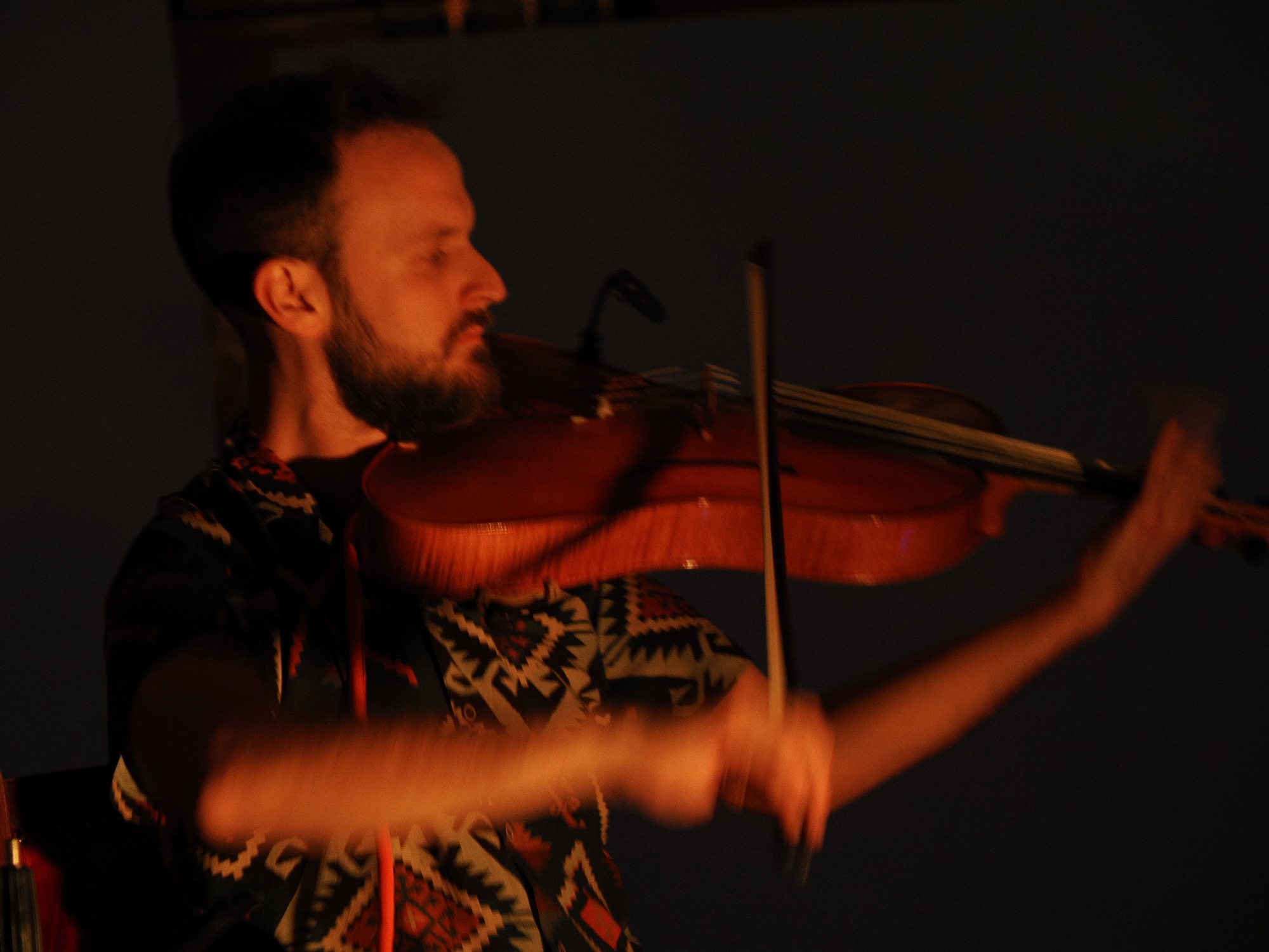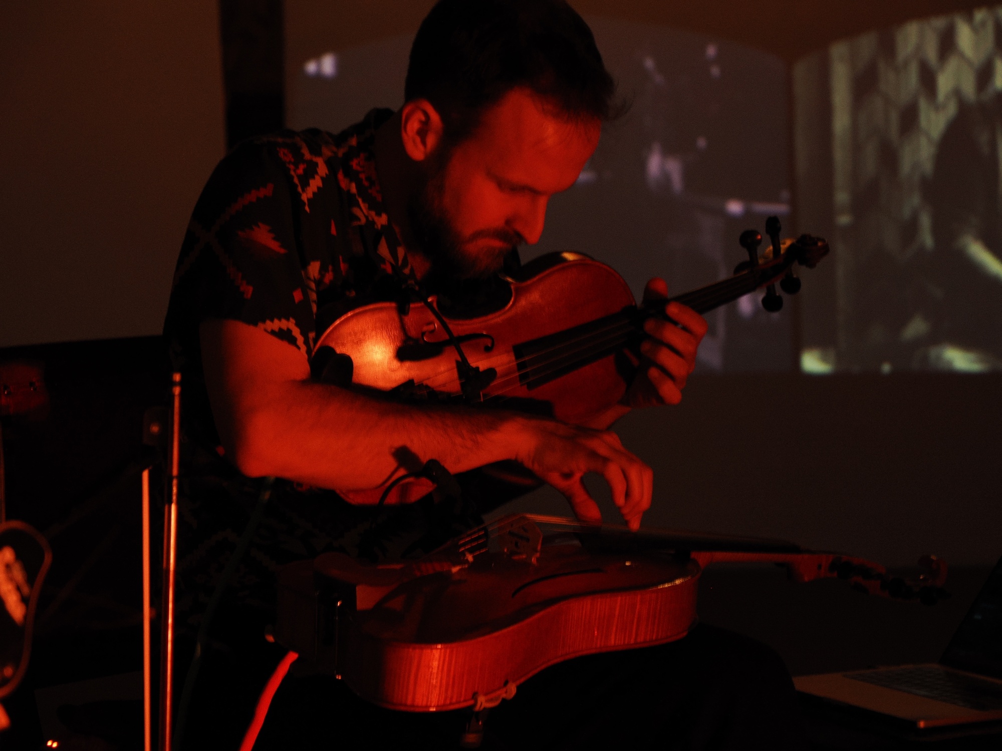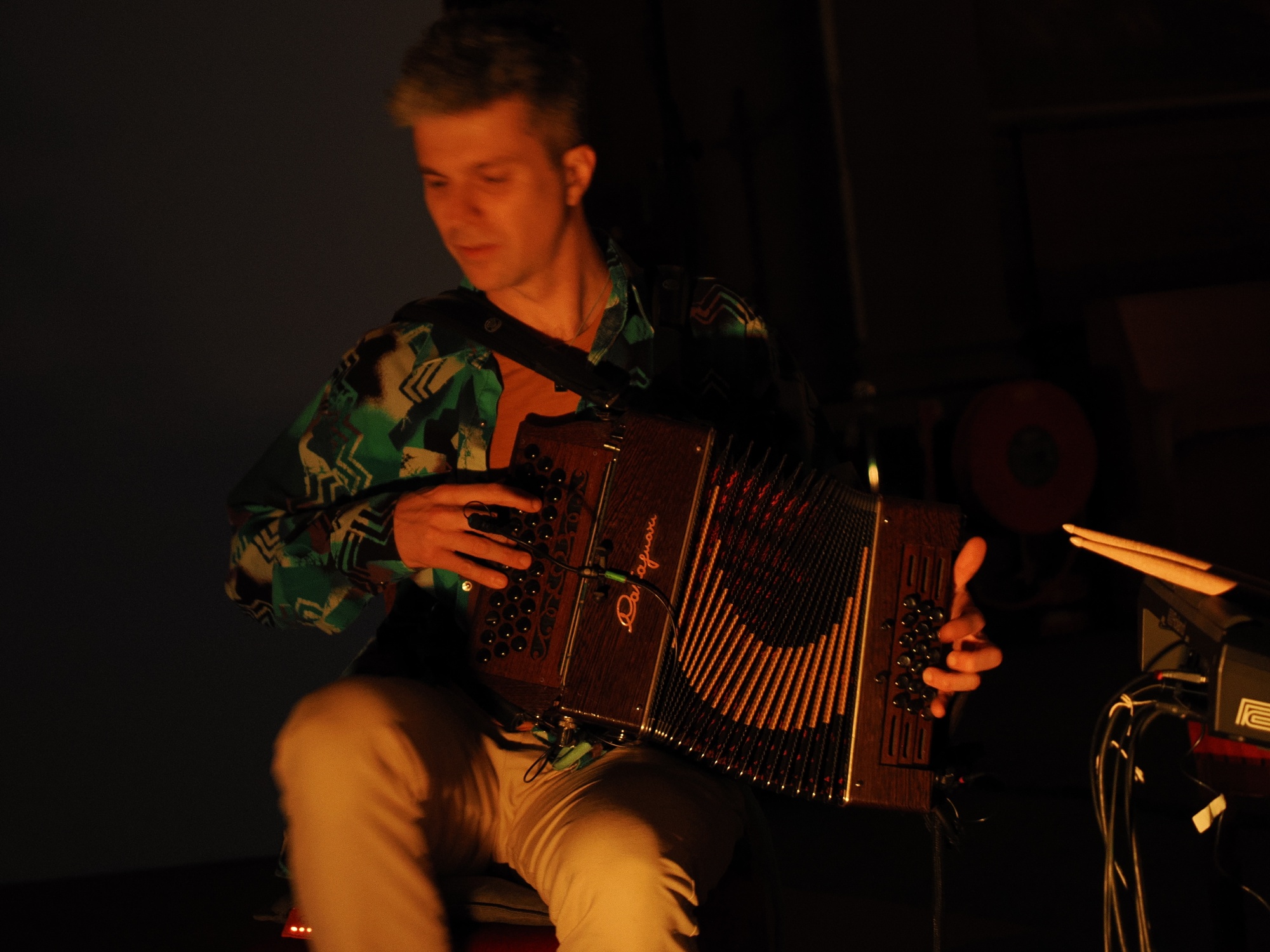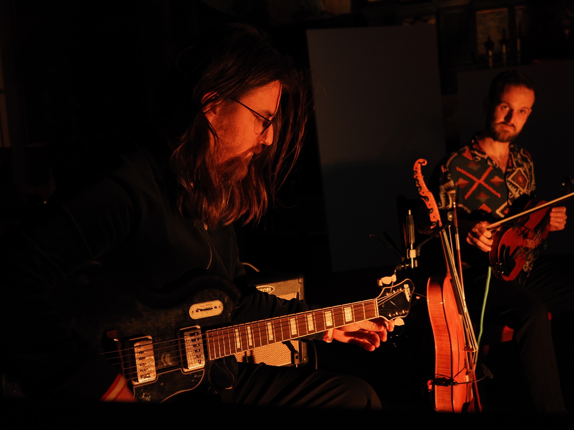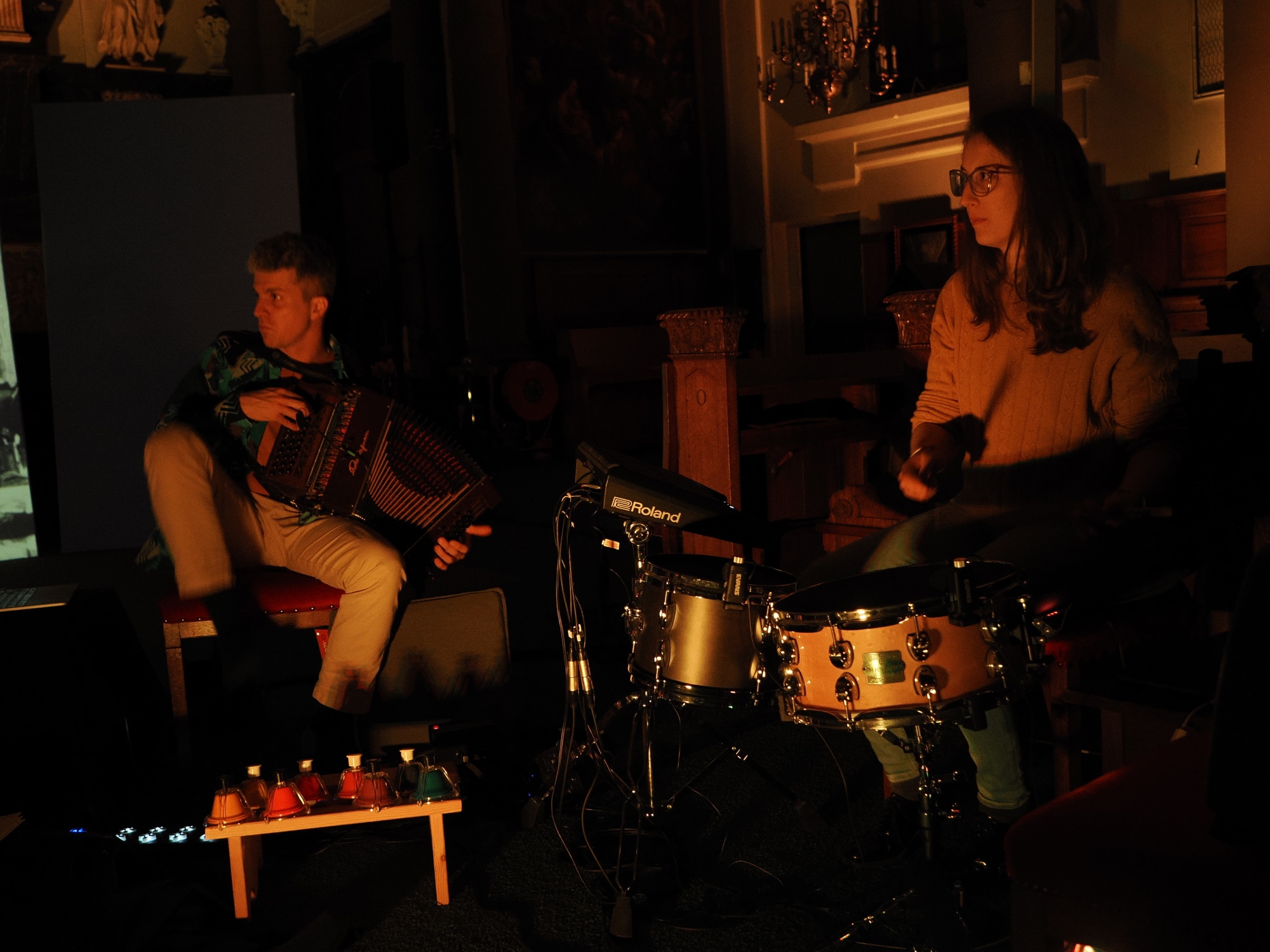 De opmerkelijke bezetting waarvoor Nicolo en Simone hun composities voor hebben geschreven, bestaat om te beginnen uit hun eigen vaste instrumentarium: (tenor)viool en trekharmonica, waar nodig aangevuld me elektronica. Slagwerker Agnese Valmaggia speelt ogenschijnlijk op een gewoon drumstel, maar de klanken die ze produceert, zijn gesampelde omgevingsgeluiden uit de door de broers tijdens hun reis gemaakte veldopnamen. Als speciale gast trad in de Paradijskerk Jelle Roozenburg aan met zijn elektrische gitaar.