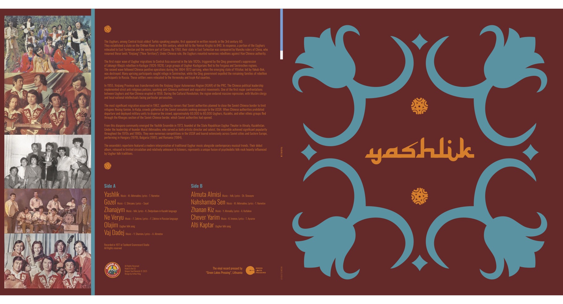 Eén zo'n (her)uitgave heb ik nu in mijn handen. Een symmetrisch ornament van bloemige turqoise vlekken op een diep paarse achtergrond; de letters in Semitische stijl die 'Yashlik' spellen, doen een plaat uit het islamitische Oosten vermoeden. En inderdaad, 'Yashlik' betekent jeugd in het Oeigoers, een van de oudere Turkse talen. Het is ook de naam van de muziekband die een centrale positie innam in het culturele leven van de Oeigoerse gemeenschap in Sovjet-Centraal-Azië tijdens de jaren zeventig en tachtig.